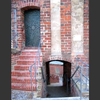 Der rechte Turm beherbergt eine kleine Treppe, die einen Zugang zum Wasser bildete. Die Tangermünder waren häufig auf das Tangerwasser angewiesen, da die Stadt nur 12 Brunnen besaß, die noch im 18. Jahrhundert nicht immer das erforderliche Trinkwasser liefern konnten.