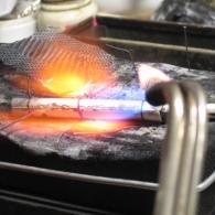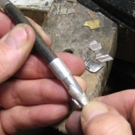 Verlöten der Längsfuge auf der Lötkohle mittels Lötrohr. Dabei ist es besonders wichtig, dass durch Zuführung von Atemluft in das Lötrohr die Arbeitstemperatur des Lotes an der Lötstelle genau erreicht wird. Abtrennen des gewünschten Teilstückes zur gestalterischen Weiterverarbeitung